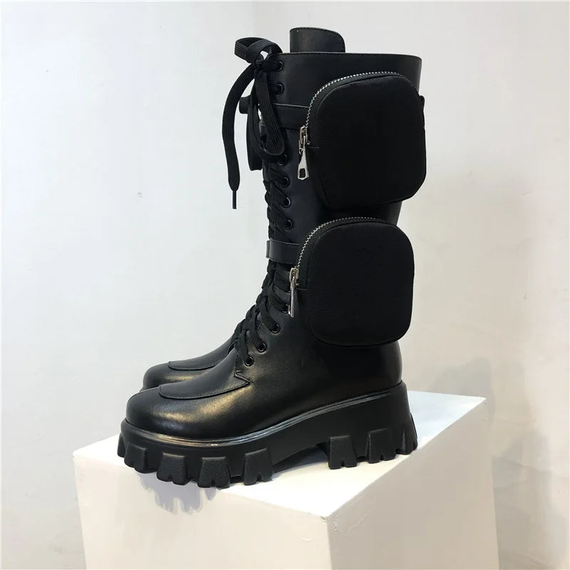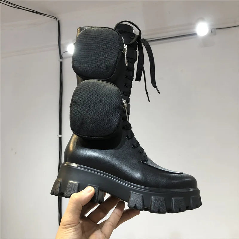 Never worry about running out of storage pockets. These womens black tactical boots have built-in pockets to store your belongings. These high-top boots are easily adjusted with a lace-up closure. The platform at the heel is about 4 cm high. The perfect synergy between utility and style with unique tactical boots.