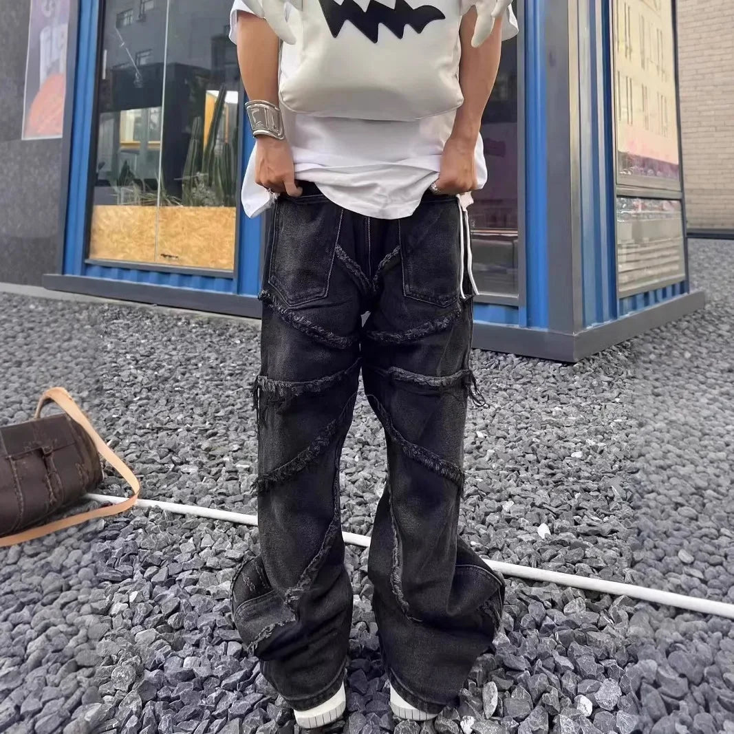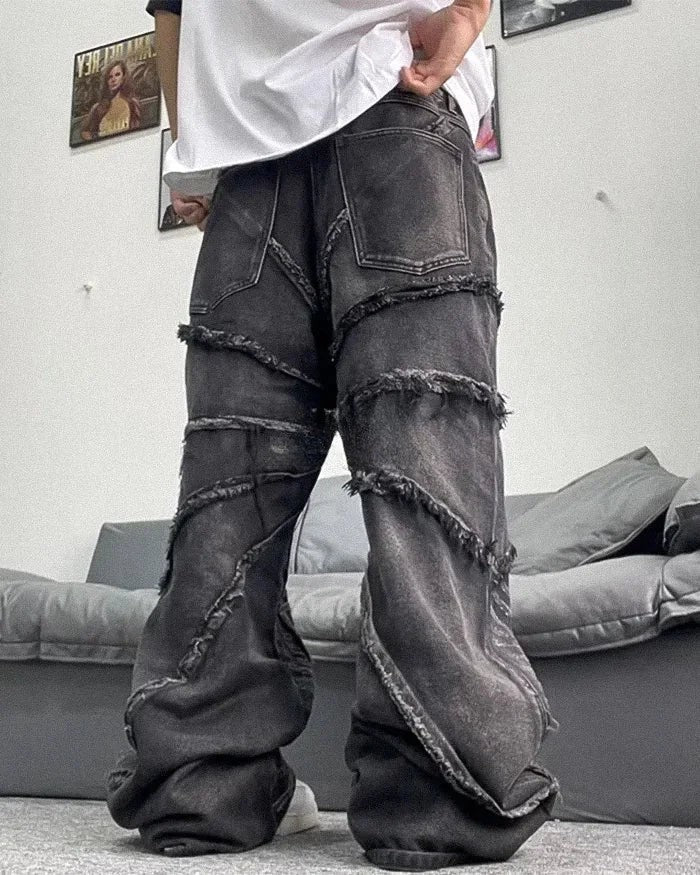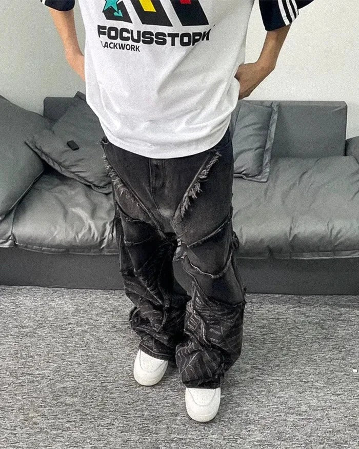 Crafted from high-quality denim, these jeans boast a durable and breathable fabric that ensures a relaxed fit without compromising on style. The oversized silhouette features wide, baggy legs for unrestricted movement, making them ideal for layering with other techwear staples. The deep black wash adds a sleek, edgy touch, while their minimalistic detailing ensures they pair seamlessly with your favorite graphic tees, hoodies, or even cropped jackets.