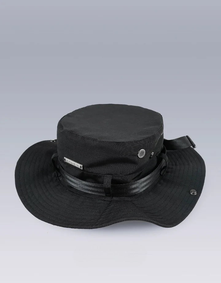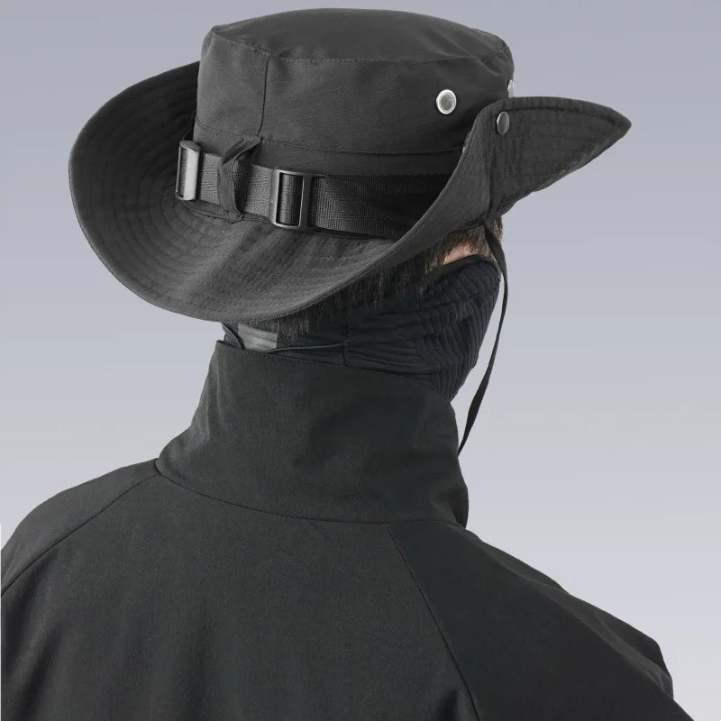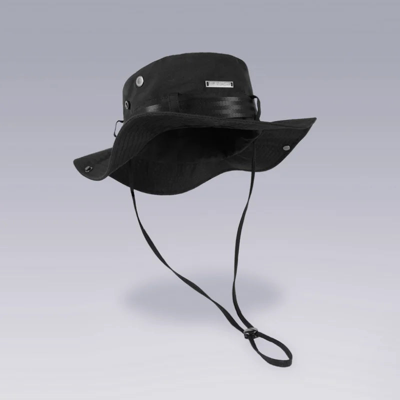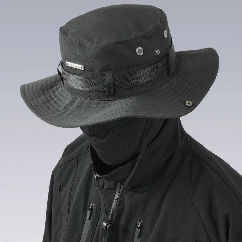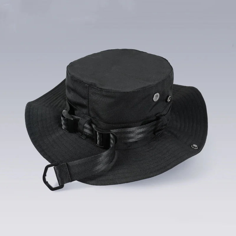 The design is inspired by techwear fashion, giving it a stylish and modern look. With its lightweight construction and versatile style, this hat is perfect to enhance your futuristic wardrobe or for wearing on a casual day. Whether you're out in the sun or braving the rain, the Tactical Bucket Hat will keep you protected and looking good.