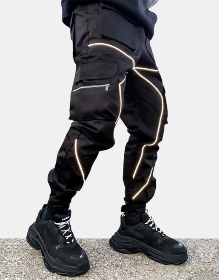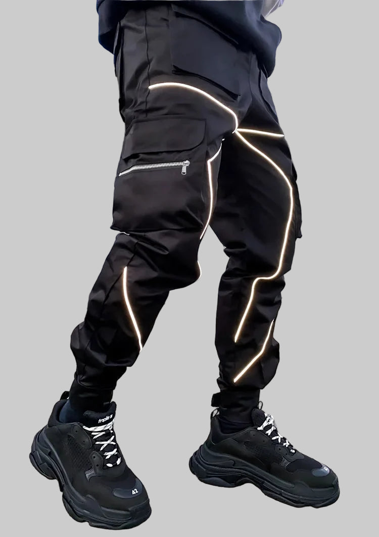 Beyond their luminescent appeal, these reflective pants prioritize your comfort. Crafted with precision, the soft fabric adapts to your every move, ensuring that every step you take is in absolute comfort. Whether you're navigating the bustling city streets or enjoying a laid-back evening, these pants are your trusty companion. The inclusion of spacious cargo pockets further amplifies their practicality, allowing you to carry essentials with ease and style.