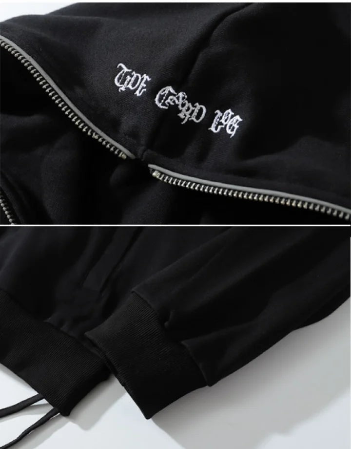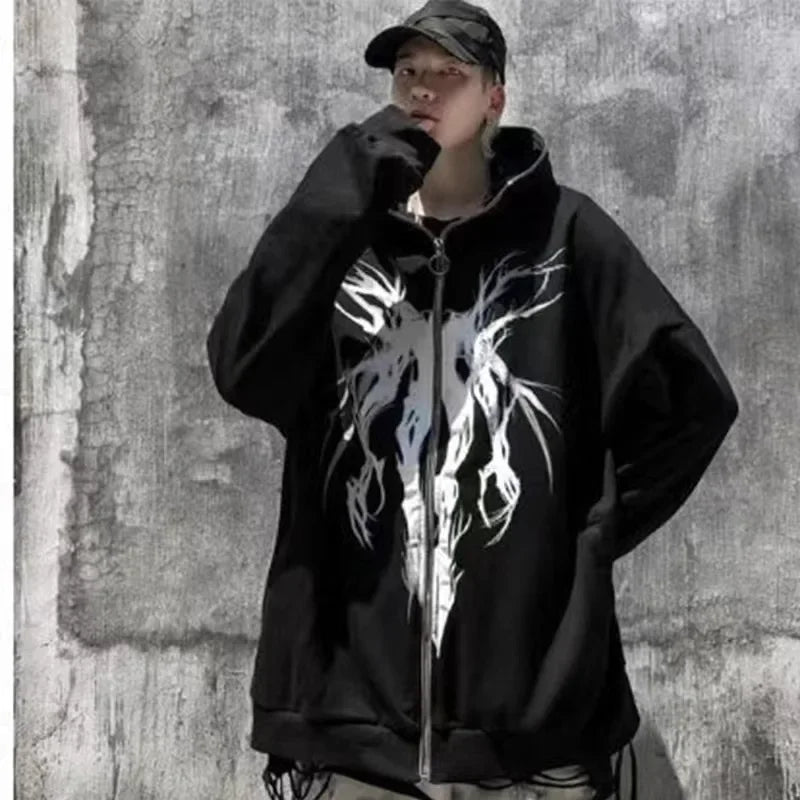 Upgrade your dark aesthetic with this grunge black hoodie. Printed in high definition with the silhouette of a demon, this black hoodie is a must-have to all who want to get a dark look. This hoodie has a quick zip closure that allows you to fully zip up the jacket as well as the hood to effectively protect you from the cold.