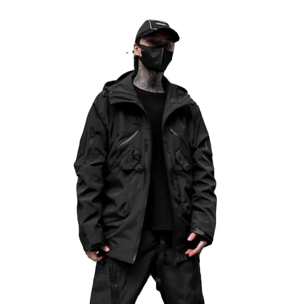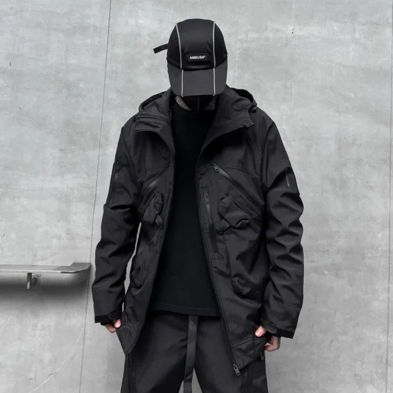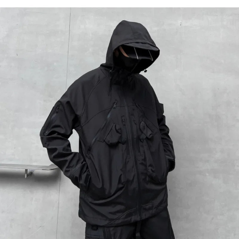 At the core of the Tactical Windbreaker's design is its robust material construction. Crafted to offer steadfast protection against strong winds, this jacket ensures that you remain unscathed and comfortable, irrespective of the weather's whims. The resilience of the fabric not only provides essential functionality but also exudes a sleek, military-inspired aesthetic, perfect for the techwear aficionado.
