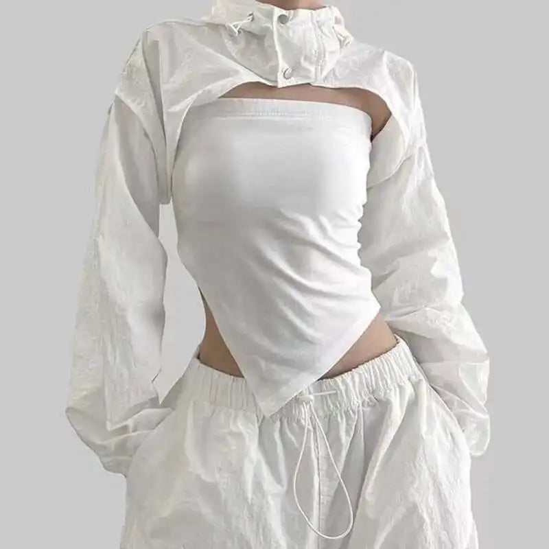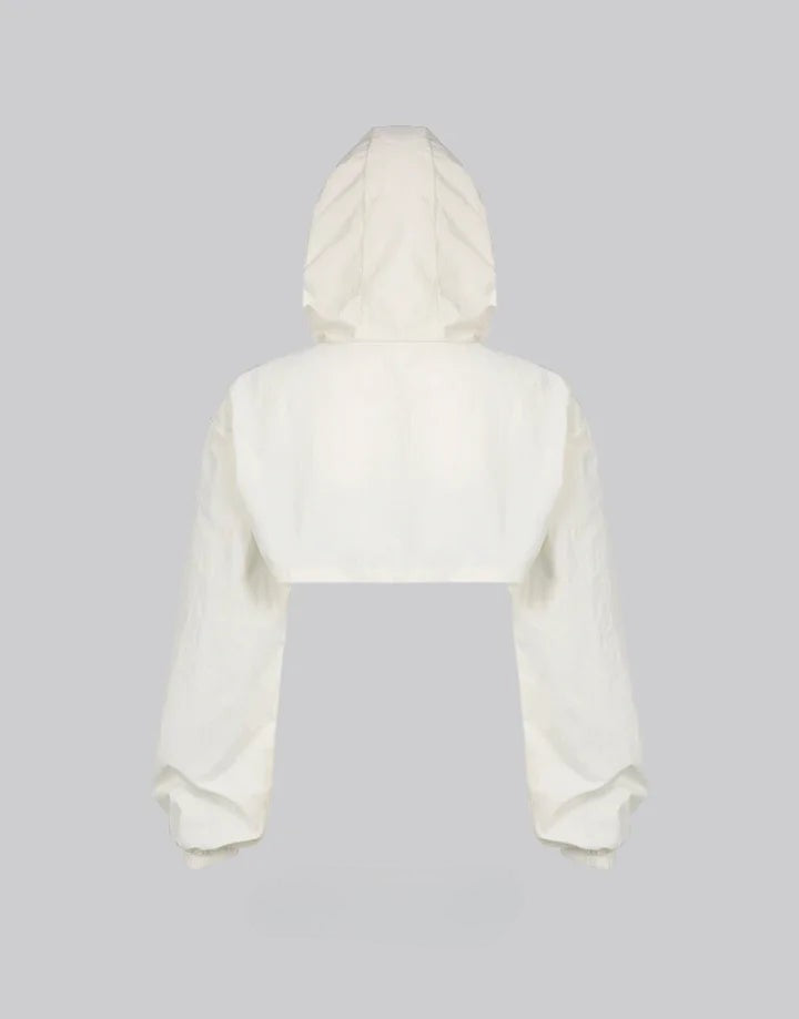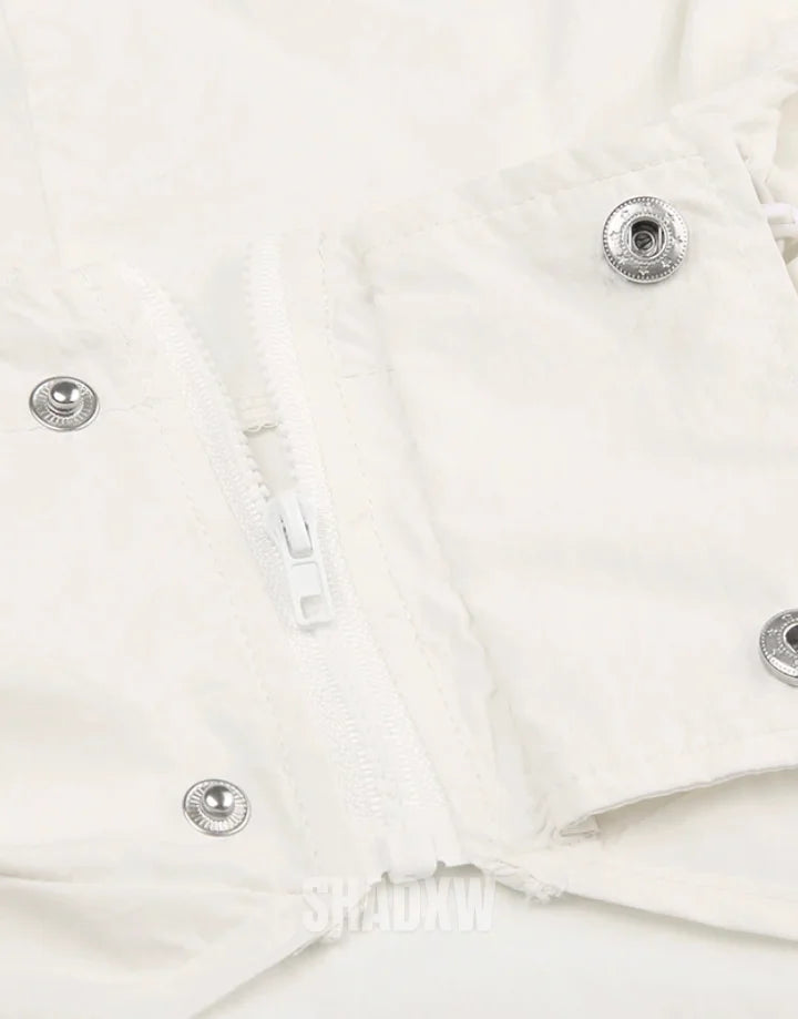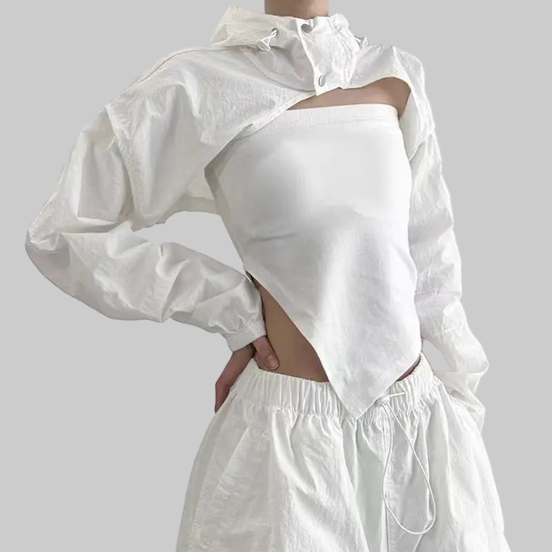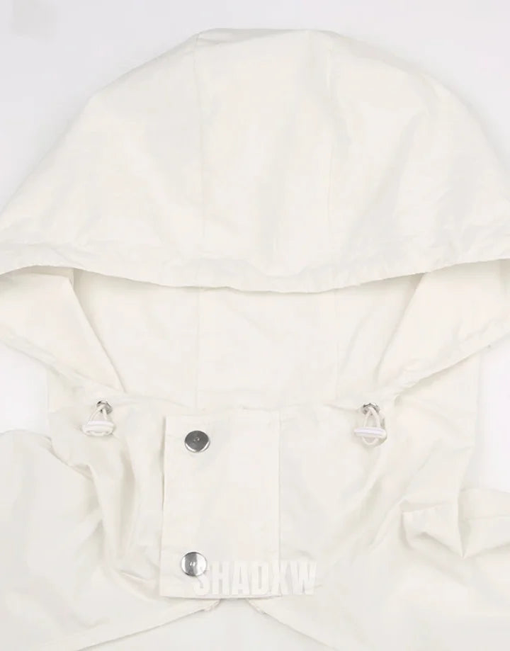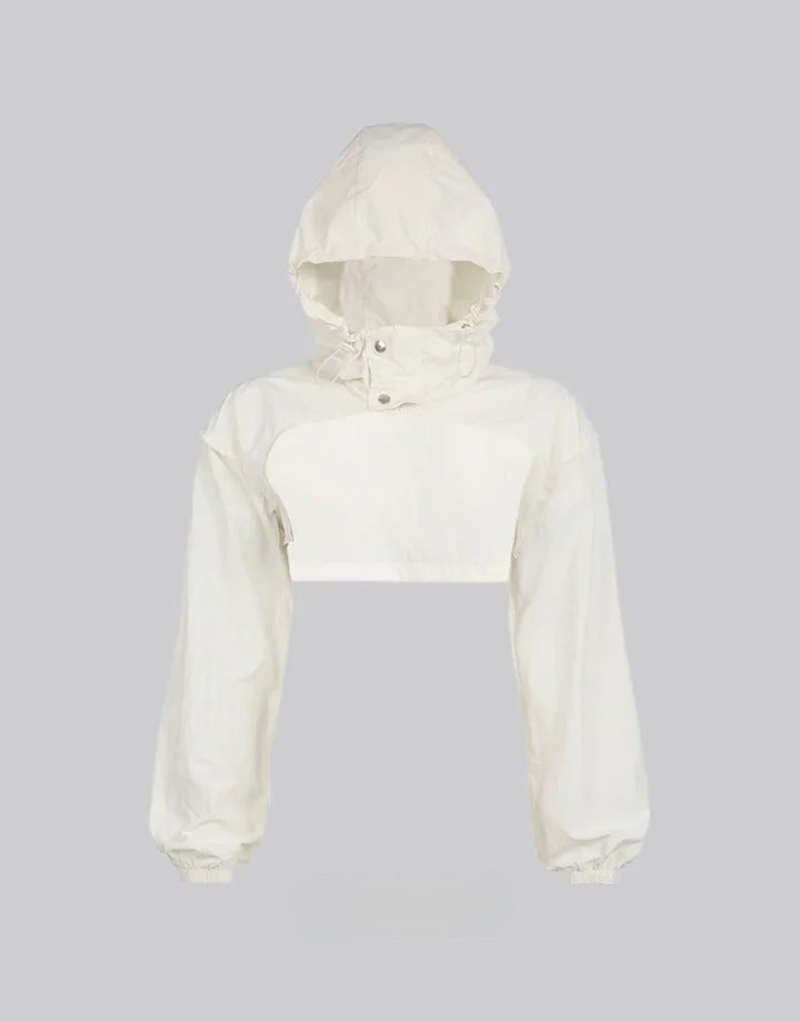 Marrying the grace of the turtleneck with the street-savvy vibe of a hood, the White Turtleneck Crop Top offers wearers an added layer of style and functionality. Its adjustable hood, zippered turtleneck, and snap buttons are not just style elements but also practical additions that enhance wearability and comfort.
