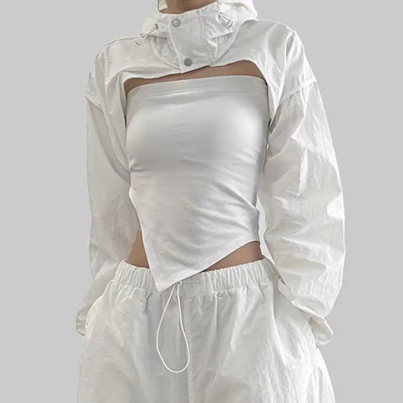 Though rooted in the techwear and streetwear genres, the versatility of the Korean Style Stacked Shawl Top ensures it complements a range of outfits. Pair it with high-waisted white jogging suits for a casual for a streetwear style. Its neutral white hue ensures it acts as the perfect canvas for all your fashion experiments.