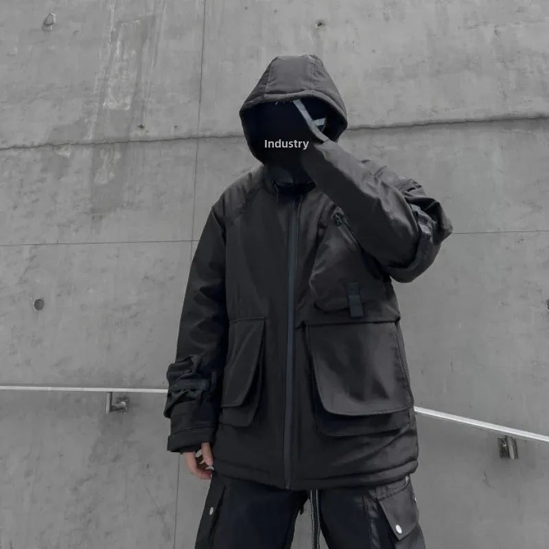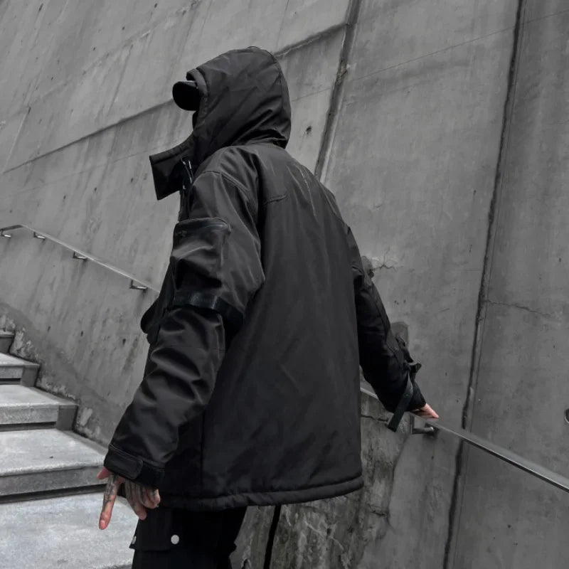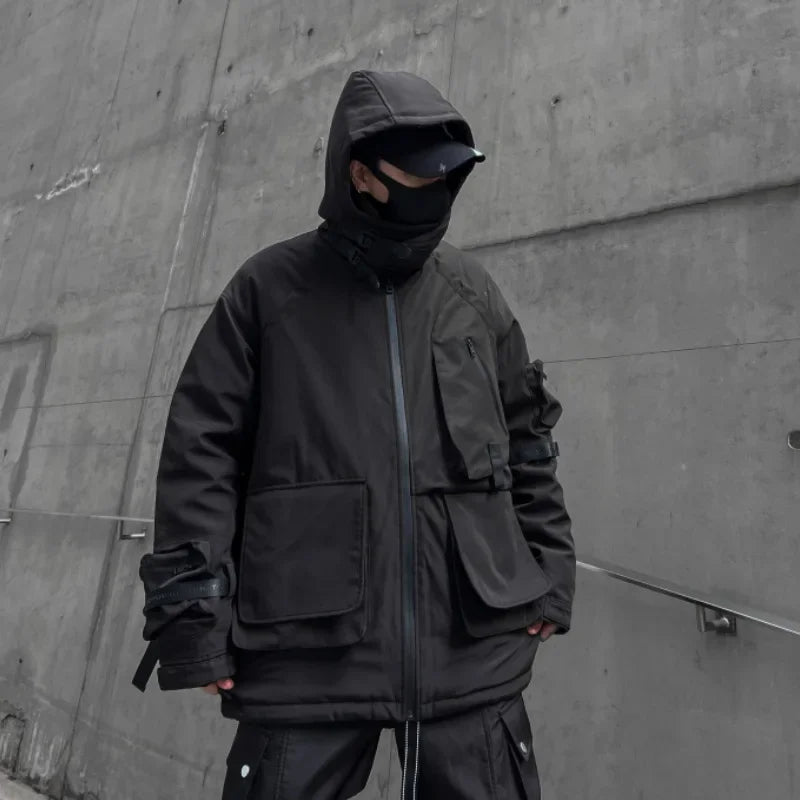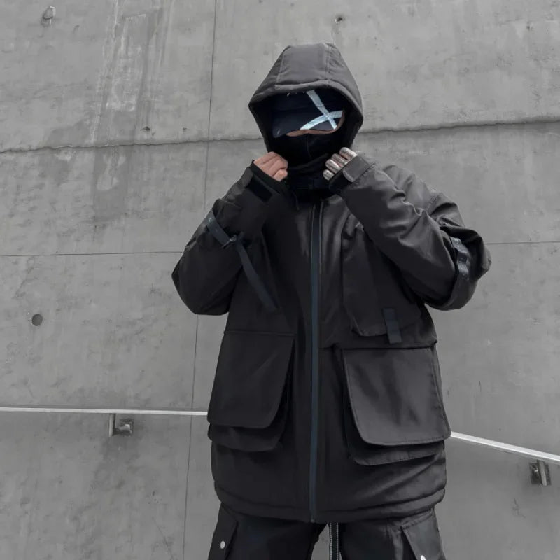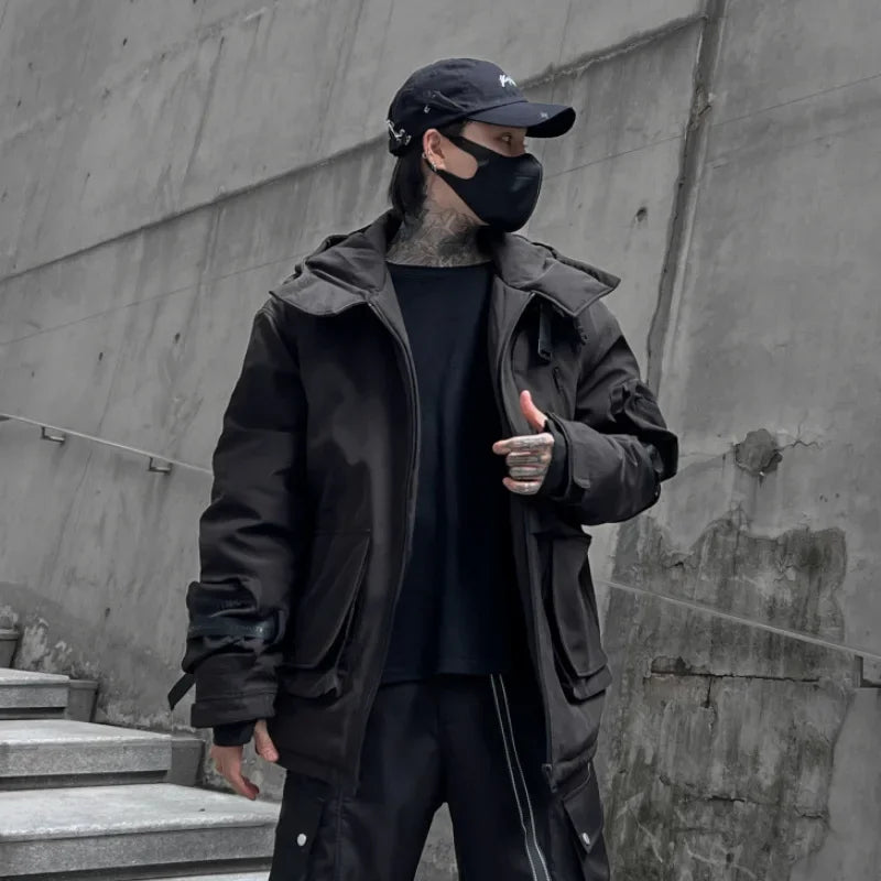 The jacket incorporates the practical aspects of tactical gear with the edgy elements of techwear fashion. Its design includes thoughtfully placed adjustable straps and fasteners that allow for a custom fit, catering to both comfort and aesthetics. The utility features are integrated into the jacket's architecture, enhancing its functionality while maintaining a cutting-edge style.
