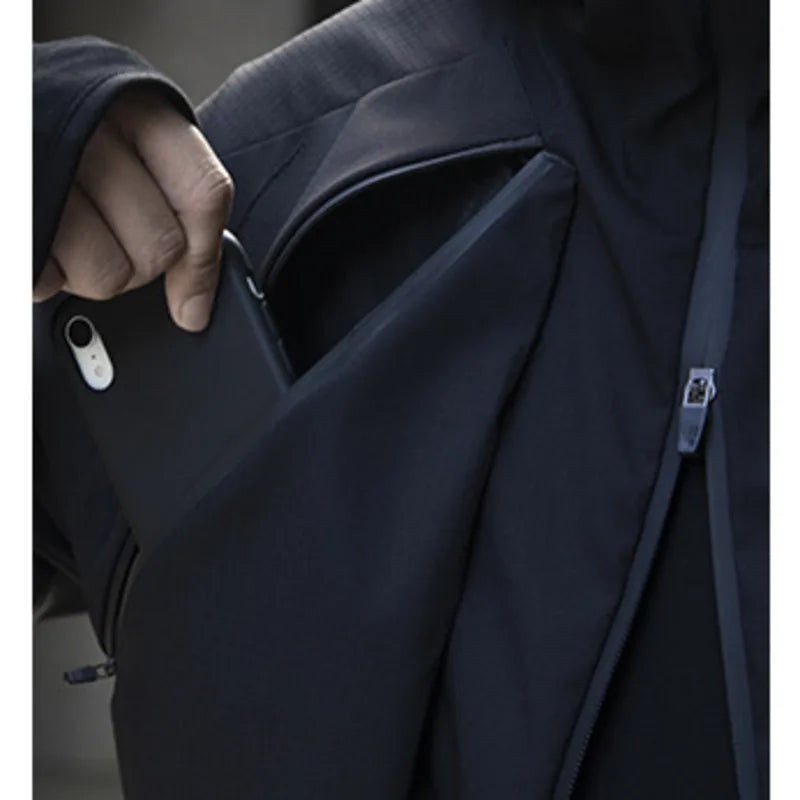 This highly functional futuristic garment features a dual pocket function positioned on the chest to quickly grab your essentials like your phone or wallet. Its high collar is lined with a waterproof fabric to protect you from the cold and rain while its back ventilation panel allows you to avoid sweating.