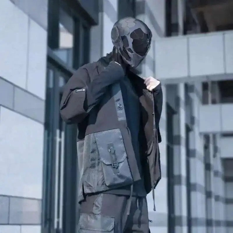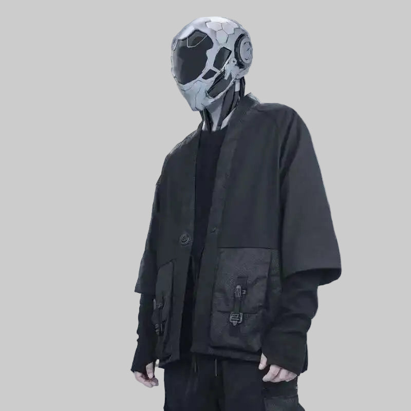 This futuristic noragi techwear is a typical Japanese garment. Similar to a kimono, its difference lies in the shorter and narrower sleeves. This garment has two patch pockets and flap pockets on the front and a drawstring fastener. The perfect outfit for an urban ninja style.