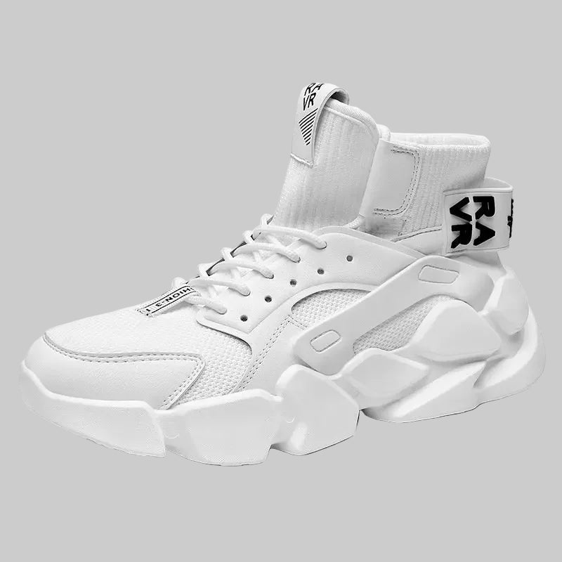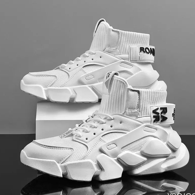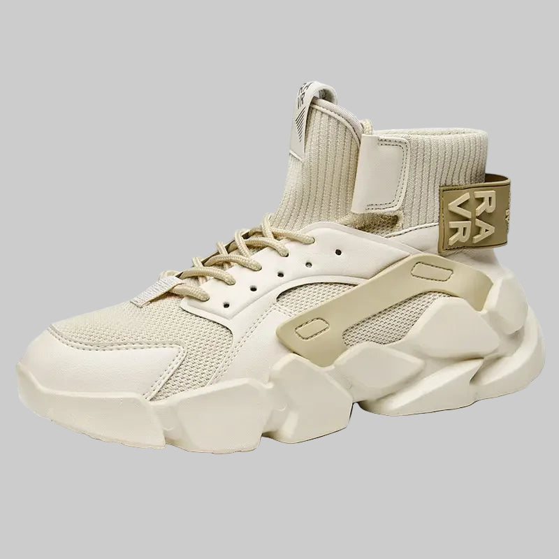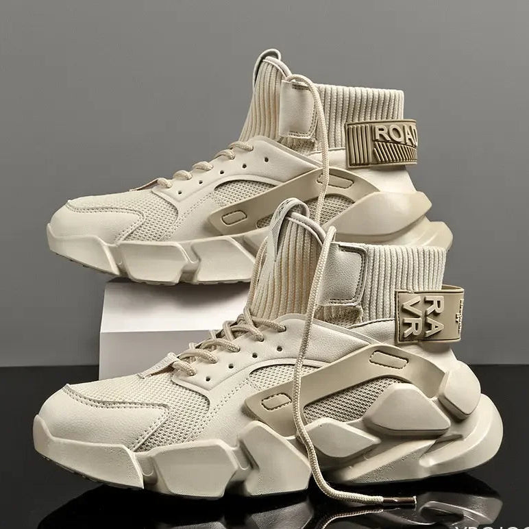 Get an avant-garde look with these technical sneakers. A sober and refine model that push the limits of aesthetic design. These high top shoes close with laces to effectively support your ankle. They are made of breathable materials for ideal comfort in summer and winter. With a thick sole and unique design, this pair of shoes is ideal to dress up your techwear outfit.