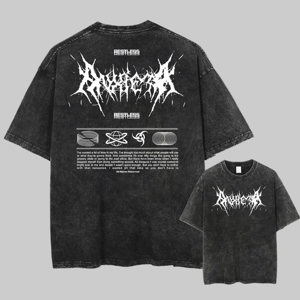 Above all of it? The word “Restless” screams twice in distorted caps, framing the main design like the top and bottom of a corrupted transmission. This shirt isn’t interested in pleasing the algorithm. It exists for the people who feel like the system isn’t built for them — because it’s not.