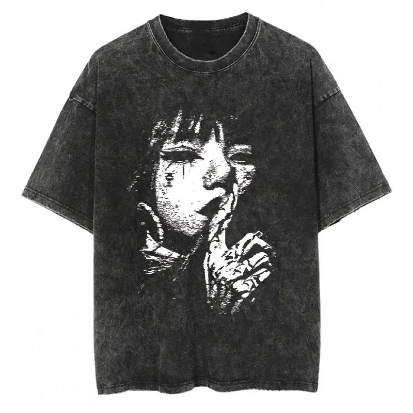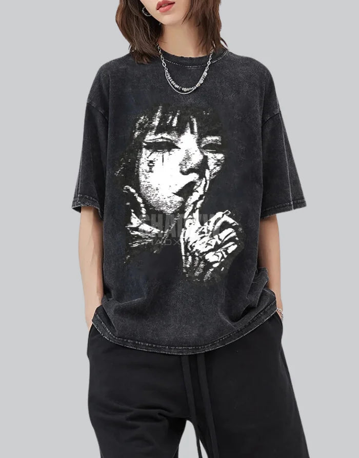What truly sets the Silence Shirt apart is its powerful graphic print. The front of the shirt features a hauntingly evocative image: a figure with a finger raised to their lips, signaling quiet, mystery, and perhaps defiance. This image is printed in a high-contrast white against the dark fabric, creating a striking visual that draws attention without ever needing to shout. The gesture of silence becomes a metaphor – an invitation for introspection or a statement against the noise of the world.
