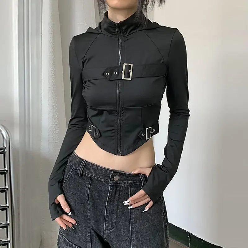 The Streetwear Crop Top shines in its sleek black hue, an embodiment of mystery and rebellious essence. The long sleeves shield your arms with a gentle embrace, offering both comfort and a bold aesthetic appeal. The unique strap buckle at the chest allows a subtle display of daring, making this crop top an epitome of modern street style.