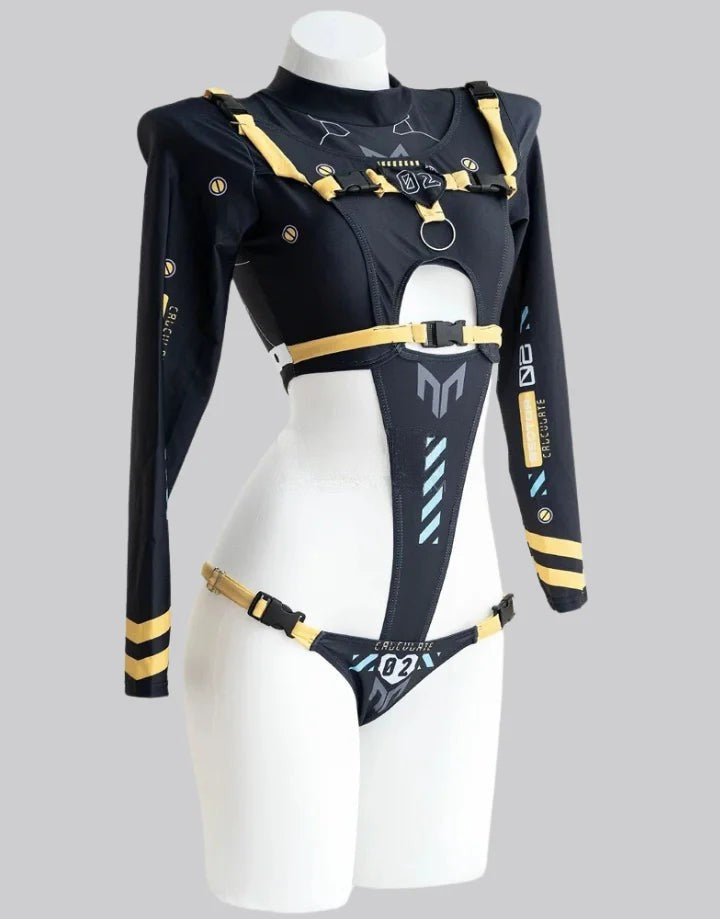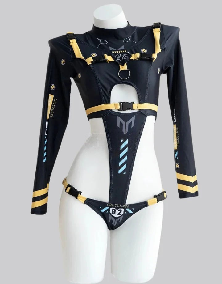 A cutting-edge ensemble designed for the bold and the daring. Inspired by the dynamic world of cybernetics and high-tech fantasies, this bodysuit is crafted for those who wish to stand out and make a statement. This bodysuit embodies the essence of cyberpunk aesthetics, featuring sharp geometric patterns and bold digital motifs. The integration of gold utility straps not only enhances its futuristic look but also ensures adjustable fitting, making it suitable for various body types. High-quality zippers and strategic cut-outs add both functionality and a touch of provocative charm, perfect for the modern rebel.